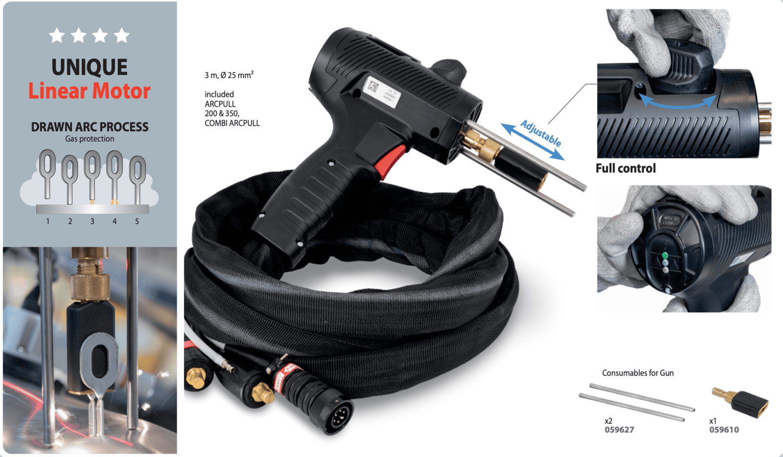 Delivers controlled drawn arc welds for aluminum and steel studs/keys up to Ø 0.23”. Features a linear-motor digital gun with dual ground electrodes, synergic and manual modes, and gas protection for clean, repeatable welds.